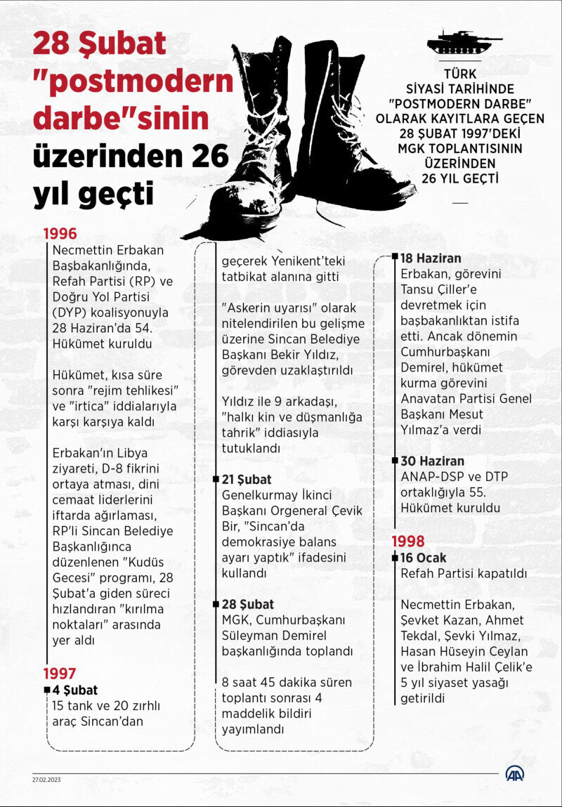 Türk siyasi tarihine "Postmodern darbe" olarak geçen 28 Şubat 1997'deki Milli Güvenlik Kurulu (MGK) toplantısının üzerinden 26 yıl geçti. Etimesgut Zırhlı Birlikler Okuluna ait tanklar 4 Şubat 1997'de Sincan'da motorlu yürüyüş yaparak Akıncı Üssü'ne gitmişti.