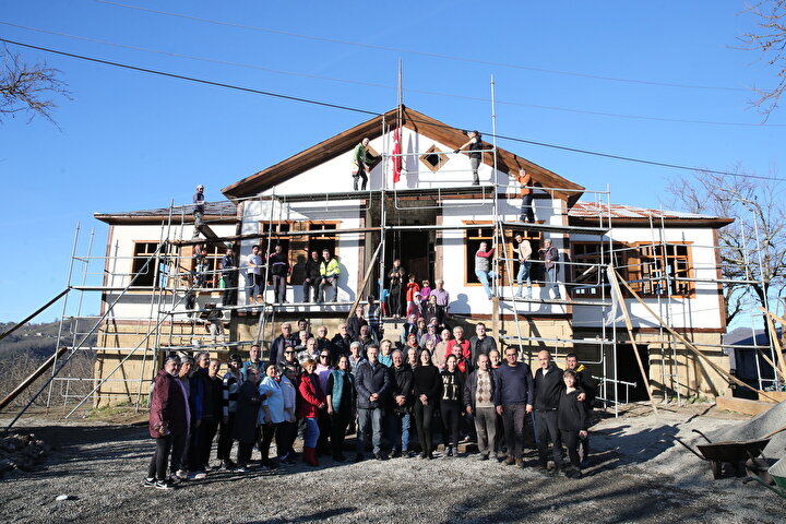 Giresun'da 1932 yılında devlet millet işbirliğiyle yapılan ve yine devlet millet işbirliğiyle restore edilen tarihi okulun 90 yıl önceki açılışında çekilen fotoğraf, köy halkı ile yeniden çektirildi.