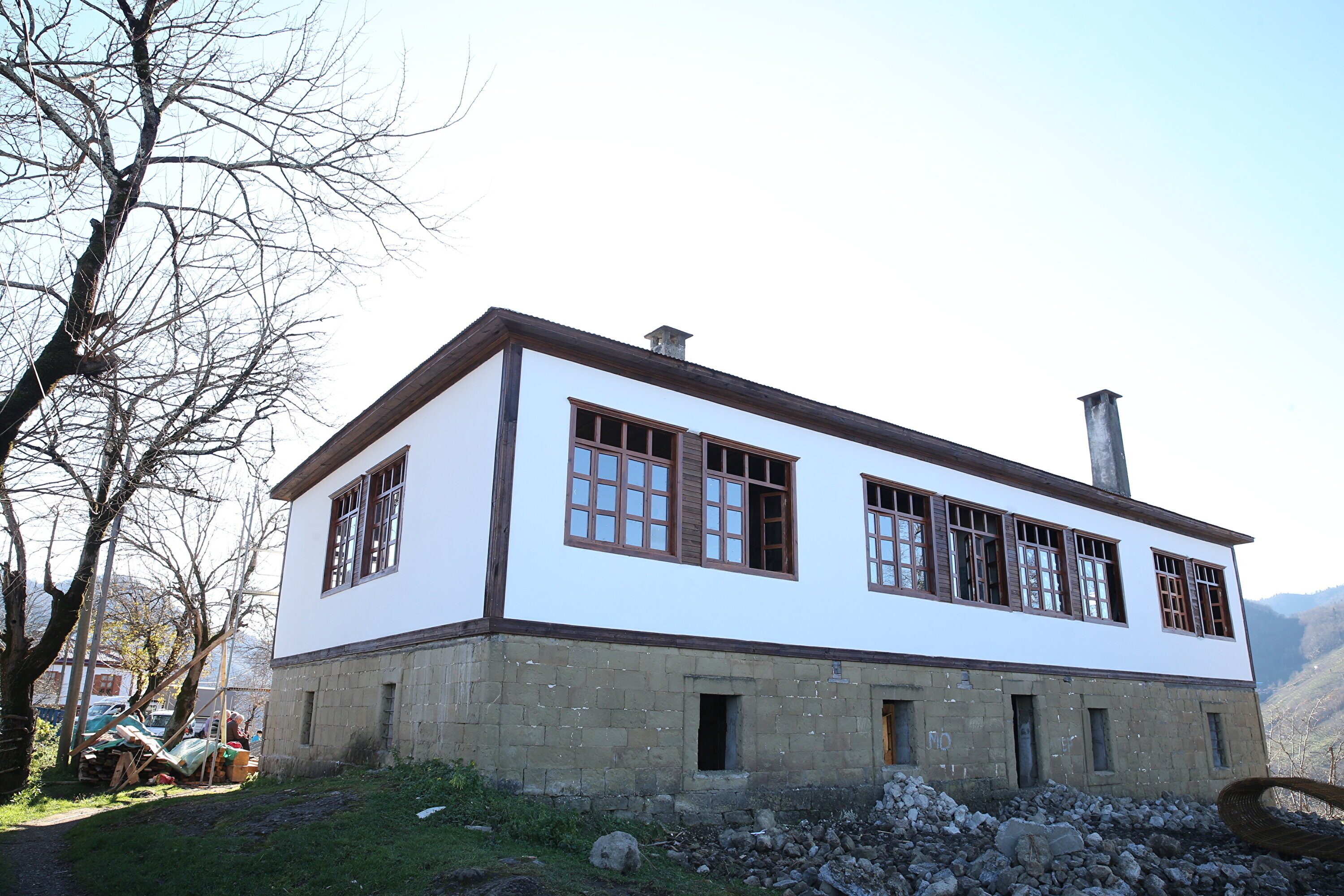 Giresun'da 1932 yılında devlet millet işbirliğiyle yapılan ve yine devlet millet işbirliğiyle restore edilen tarihi okulun 90 yıl önceki açılışında çekilen fotoğraf, köy halkı ile yeniden çektirildi.