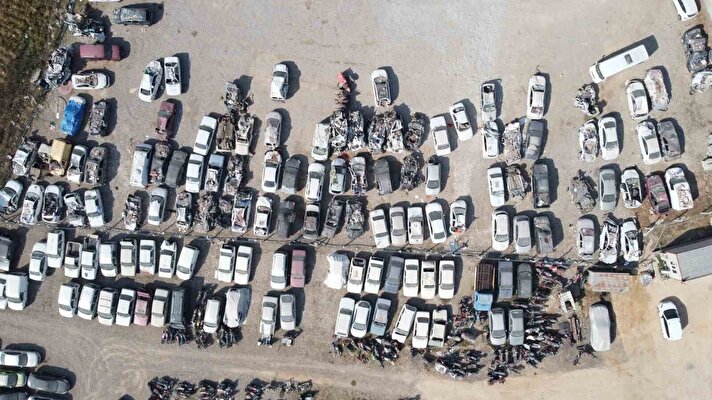 Adıyaman’da enkaz altında kalan ve hurdaya dönen yüzlerce aracın kaldırıldığı yediemin otoparkları havadan görüntülendi. Kentte kaldırılmayan enkazlar altında ise onlarca araç bulunuyor.