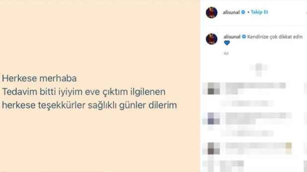 "TEDAVİM BİTTİ, EVE ÇIKTIM" Sağlık durumu merak edilen Ali Sunal, sosyal medya hesabından yaptığı açıklama ile koronavirüsü yendiğini açıklamıştı. Ünlü oyuncu, "Herkese merhaba. Tedavim bitti, iyiyim, eve çıktım. İlgilenen herkese teşekkürler. Sağlıklı günler dilerim. Kendinize çok dikkat edin" mesajıyla sevenlerine müjdeli haberi vermişti.