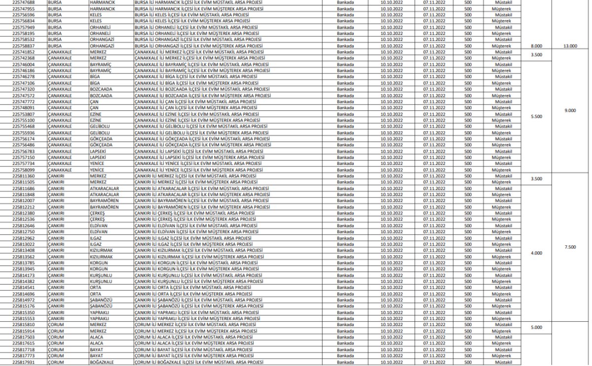 1 milyon arsa ve 10 bin iş yeri için bugün başlayan başvurular 7 Kasım tarihine kadar devam edecek. İşte il il, ilçe ilçe, mahalle mahalle yapılacağı arsa listesi...