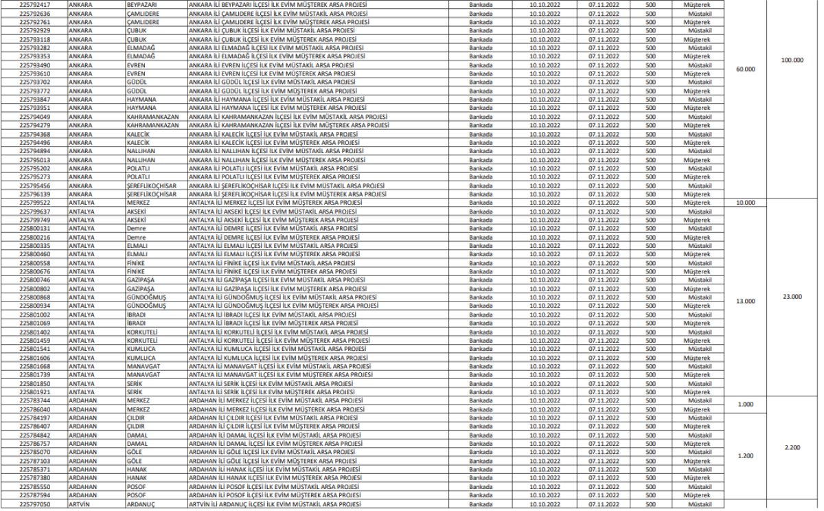 1 milyon arsa ve 10 bin iş yeri için bugün başlayan başvurular 7 Kasım tarihine kadar devam edecek. İşte il il, ilçe ilçe, mahalle mahalle yapılacağı arsa listesi...