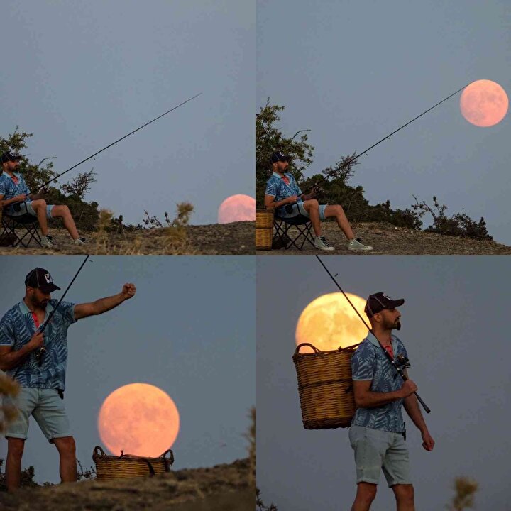 Toplam 13 sayfadan 9. sayfadasınız.'Mersin Balığı Ayı' olarak bilinen ağustos ayında Uşak Ulubey'de kaydedilen fotoğrafa bir kişinin dolunayı balık tutar gibi tutmaya çalıştığı ve sırtındaki sepette taşımaya çalıştığı yansıtıldı.