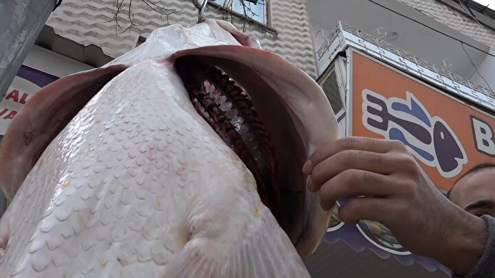 Elazığ'da, Keban Baraj Gölü'nde 175 santimetre boyunda ve 128 kilo ağırlığında 'Fırat turnası' yakalandı. Balıkçı Fatih Gökdere 'Yiğido' adını verdiği balığı dükkanının önünde burada sergilemeye başladı. Vatandaşlar ise balıkla fotoğraf çektirmek için sıraya giriyor.
