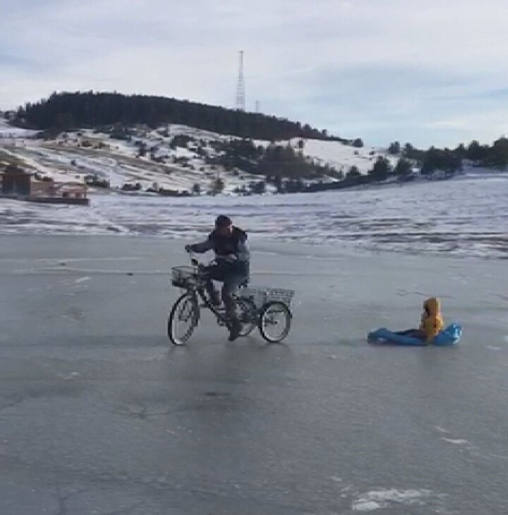 Burası Çıldır değil Sinop: Buz tutan gölde bisiklet sürdüler
