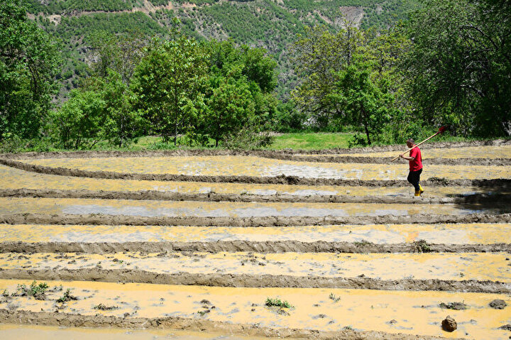 Çamur havuzlarına geleneksel yöntemlerle pirinç ekimi!