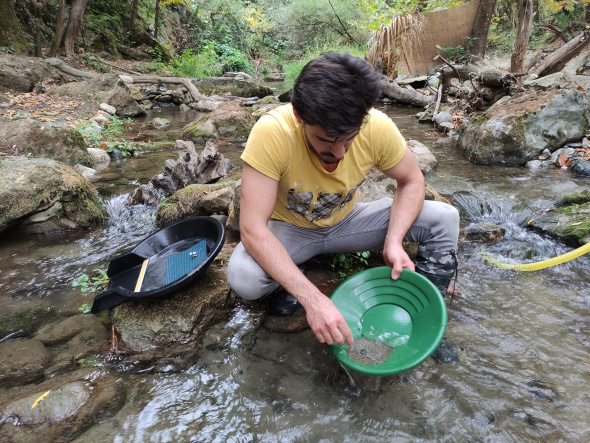 6 yıldır derelerde doğal altın aradığını ifade eden Emre Aydın, "Altın avcısıyım Bu işe 6 yıl önce hobi olarak başladım. Bu altın doğada her yerde bulunuyor. Bu sadece aramasını ve yerini bileceksin. Biz 6 yıllık tecrübemizle nerelerden çıktığını tespit edebiliyoruz.