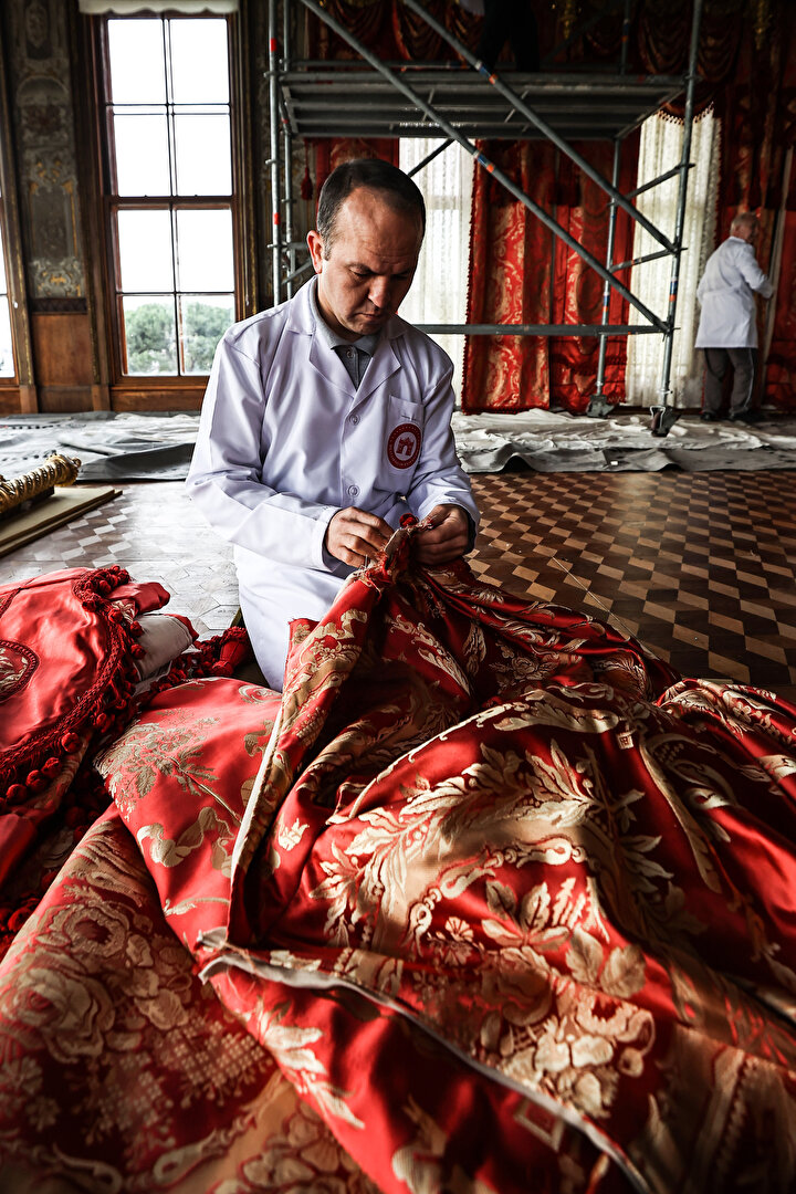Osmanlı döneminin simge yapılarından Dolmabahçe Sarayı'nın ihtişamlı salonlarını süsleyen perdelerin tamamı, Milli Saraylar Tekstil Konservasyon ve Restorasyon Atölyesi'nde uzman ekipçe titizlikle ve aslında sadık kalınarak onarılıyor.