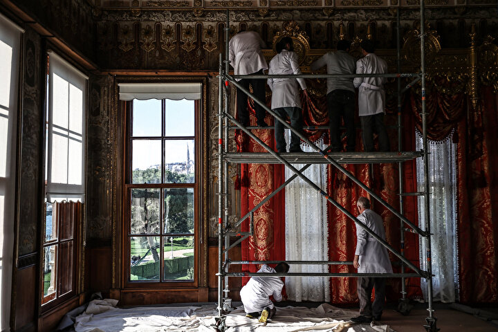 Osmanlı döneminin simge yapılarından Dolmabahçe Sarayı'nın ihtişamlı salonlarını süsleyen perdelerin tamamı, Milli Saraylar Tekstil Konservasyon ve Restorasyon Atölyesi'nde uzman ekipçe titizlikle ve aslında sadık kalınarak onarılıyor.