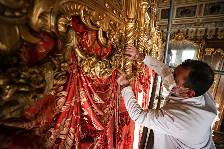 Osmanlı döneminin simge yapılarından Dolmabahçe Sarayı'nın ihtişamlı salonlarını süsleyen perdelerin tamamı, Milli Saraylar Tekstil Konservasyon ve Restorasyon Atölyesi'nde uzman ekipçe titizlikle ve aslında sadık kalınarak onarılıyor.