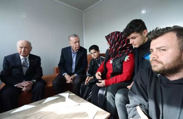 Cumhurbaşkanı Recep Tayyip Erdoğan, Devlet Bahçeli ve Mustafa Destici 6 Şubat'ta meydana gelen 7,6 büyüklüğündeki ikinci depremin merkez üssü Kahramanmaraş'ın Elbistan ilçesinde incelemelerde bulundu.