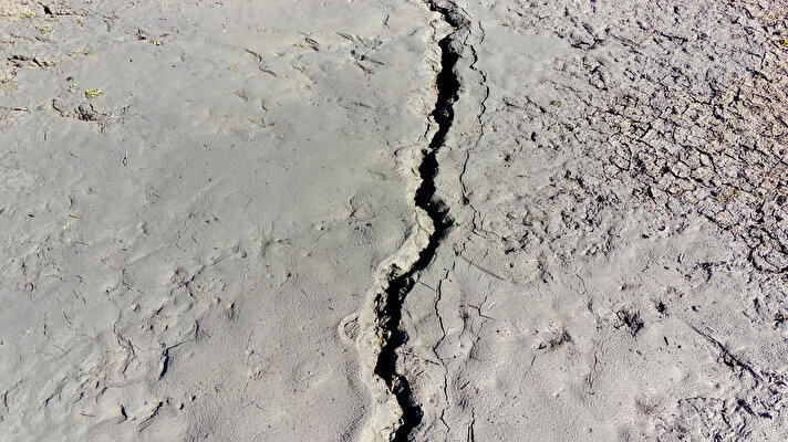 Elazığ'da 17 Şubat'ta meydana gelen 4,6 büyüklüğündeki depremin ardından suların çekildiği Keban Baraj Gölü sahasındaki yaklaşık 20 kilometrelik fay hattında yarıklar oluşturan zemin sıvılaşması dron ile görüntülendi.