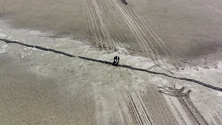 Elazığ'da 17 Şubat'ta meydana gelen 4,6 büyüklüğündeki depremin ardından suların çekildiği Keban Baraj Gölü sahasındaki yaklaşık 20 kilometrelik fay hattında yarıklar oluşturan zemin sıvılaşması dron ile görüntülendi.