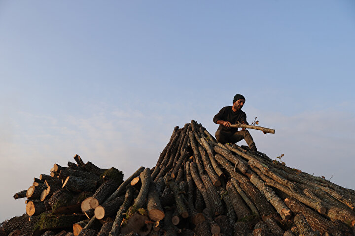 Sabahın erken saatlerinde kesim için ormana giden işçiler, traktöre yükledikleri meşe odunlarını ocakların bulunduğu sahaya getiriyor.