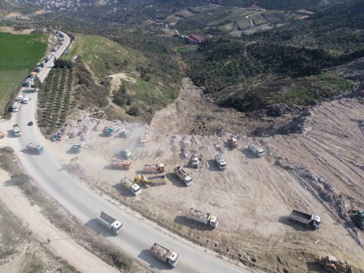 Hatay’da meydana gelen depremlerin ardından yıkılan binaların enkazını taşıyan hafriyat kamyonları metrelerce kuyruk oluşturdu. Yüzlerce hafriyat kamyonunun boş alana mekik dokuduğu o anlar drone ile görüntülendi.