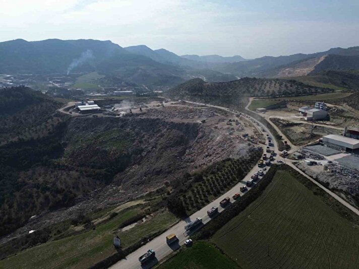 Hatay’da meydana gelen depremlerin ardından yıkılan binaların enkazını taşıyan hafriyat kamyonları metrelerce kuyruk oluşturdu. Yüzlerce hafriyat kamyonunun boş alana mekik dokuduğu o anlar drone ile görüntülendi.