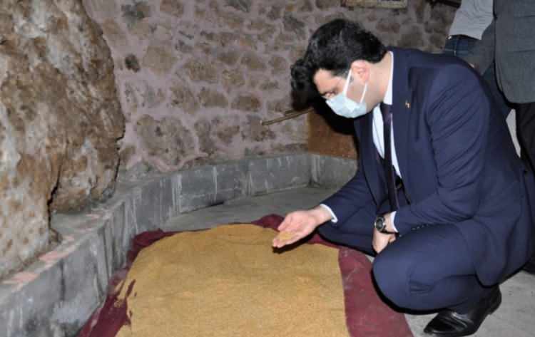 400 Yıllık değirmende öğütülüyor Çiftçilerin büyük emekle üreterek Kaymakamlığa sattığı susam, yıkanarak kabuğundan ayrıldıktan sonra odun ateşiyle ısıtılan fırında özenle kavruluyor.