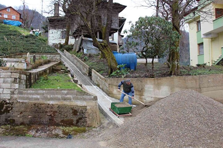 Trabzon'da ev yapacağı araziye yol gitmediği için 55 metre uzunluğundaki patika yola ray döşeyen Mehmet Hacıefendioğlu, inşaat malzemelerini teleferik yardımıyla bu yolla taşıyor.