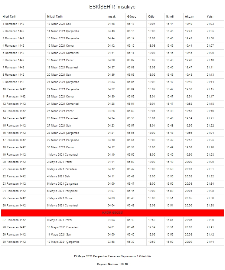 2021 oruç saat kaçta açılacak? Diyanet İşleri Başkanlığı'nın resmi internet sitesinden il il imsakiye takvimi yayınlandı. İşte il il imsakiye 2021 - İftar ve sahur vakitleri...