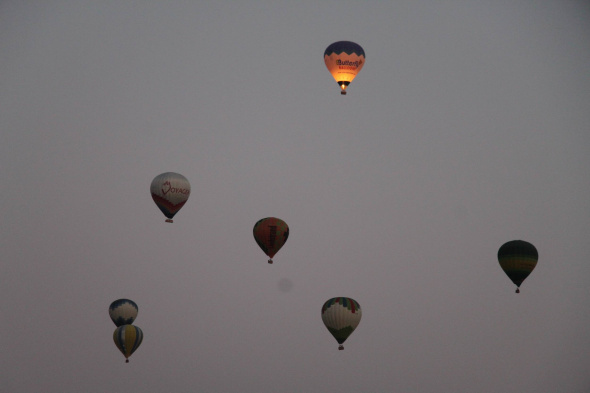 Türkiye'nin önemli turizm merkezlerinden Kapadokya'da gündoğumu ile havalanan sıcak hava balonları gökyüzünde görsel şölen oluşturdu.