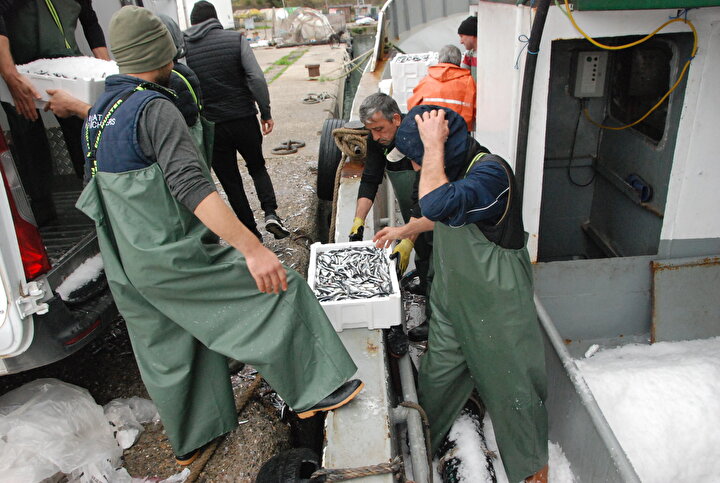 Bartın'ın Amasra ilçesi açıklarında avlanan balıkçılar, yaklaşık 375 ton hamsiyle limana döndü. Limana gelenlere ücretsiz hamsi dağıtıldı.