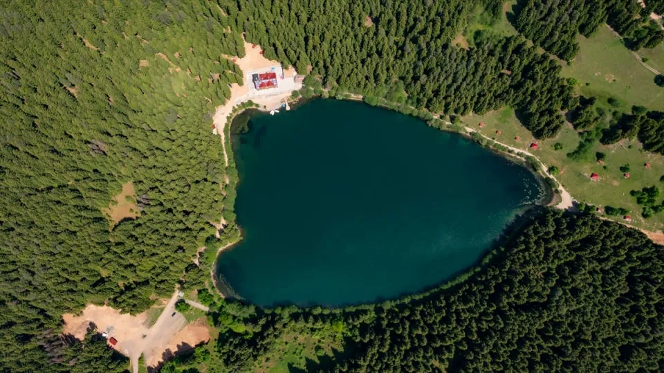 Ladin ve çam ağaçları arasında kalp şeklindeki görüntüsü ile dikkat çeken Karagöl, görenleri adeta büyülüyor.