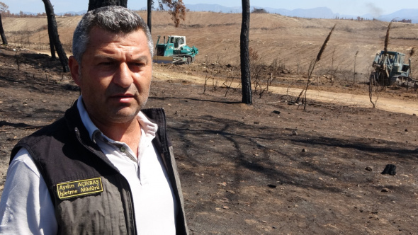 Yangından en fazla zarar gören yerlerden bir tanesi olan Kalemler Mahallesinde Orman Genel Müdürlüğü ve DSİ'ye ait iş makineleri yanan bölgeleri iş makineleriyle sürüp dikime hazırlıyor.