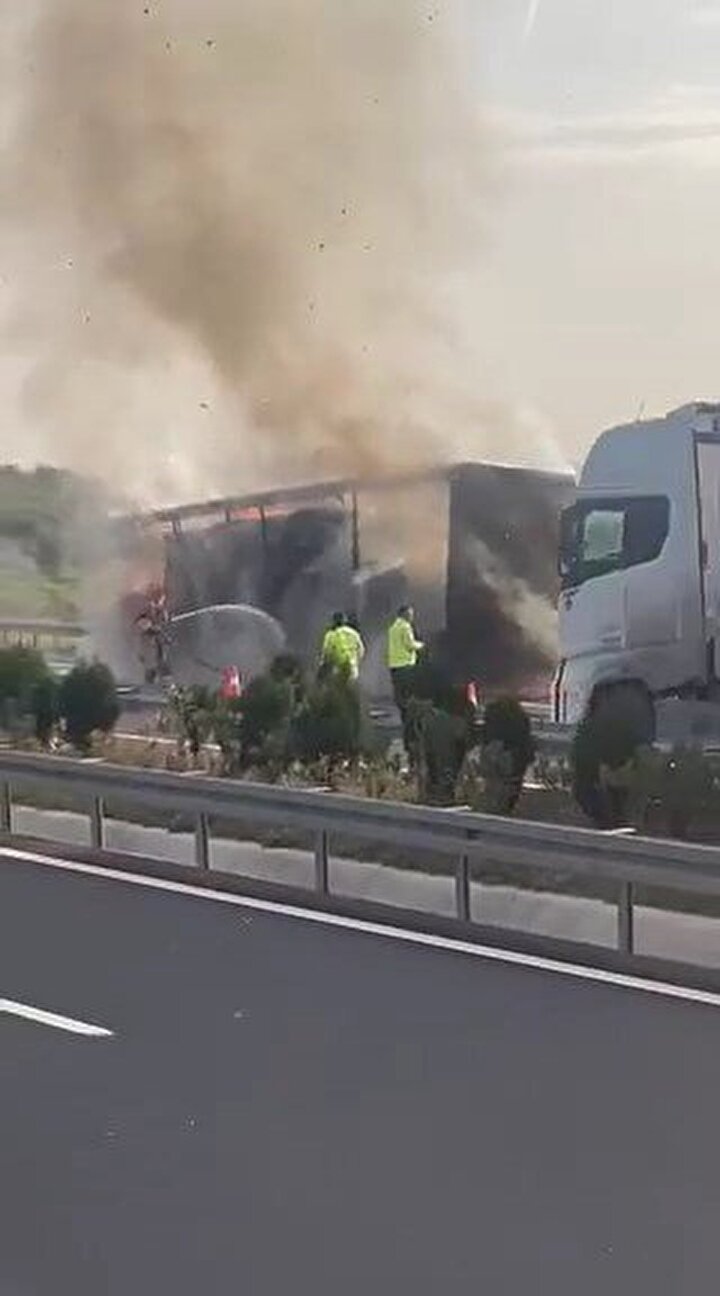 Bursa'da otobanda bir tırın dorsesinde çıkan yangın hareketli saatlere sebep oldu. Sürücü ise dorseyi tırdan ayırarak büyük bir facianın önüne geçerken; dorsenin alev alev yanma anı ise kameraya yansıdı.