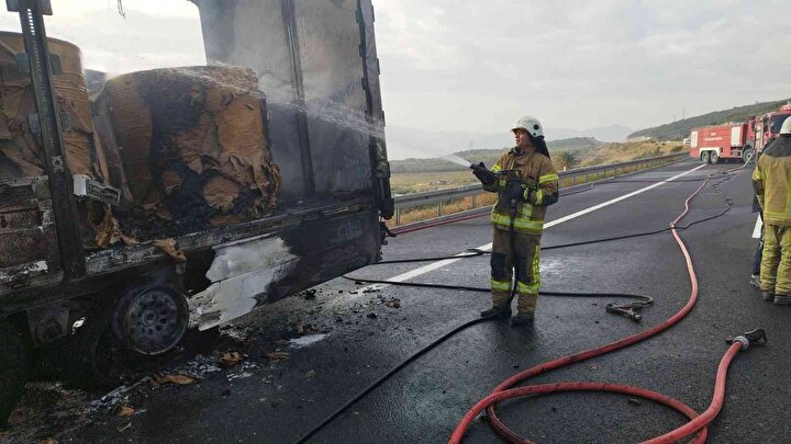 Bursa'da otobanda bir tırın dorsesinde çıkan yangın hareketli saatlere sebep oldu. Sürücü ise dorseyi tırdan ayırarak büyük bir facianın önüne geçerken; dorsenin alev alev yanma anı ise kameraya yansıdı.