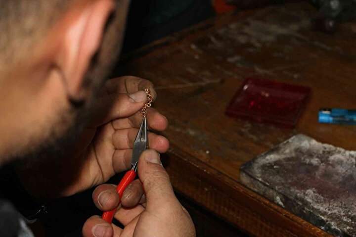 Külçe altınların eritilerek takı seti, gerdanlık ve bilezikten oluşan Diyarbakır hasırı yaptıklarını ifade eden Çakır, 'Burada ilk önce külçe altını eritiyoruz. Erittikten sonra tel haline getirip, belli gramdaki malafalara teker teker sarıyoruz. Altını güzelce örükledikten sonra örs makinesinde dövüyoruz. Bu dövme işlemi gevşek olan hasır bileziklerimizin sıklaşmasını sağlıyor. Bileziğimizi yuvarlak yaptıktan sonra kaynak yapıp her iki kenarı birleştiriyoruz. Son aşamamızda, geleneksel motifimizi bileziğin orta kısmına işledikten sonra altını asitli suyumuza sokup, altın rengini kazandırmış oluyoruz' dedi.