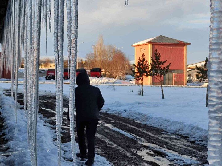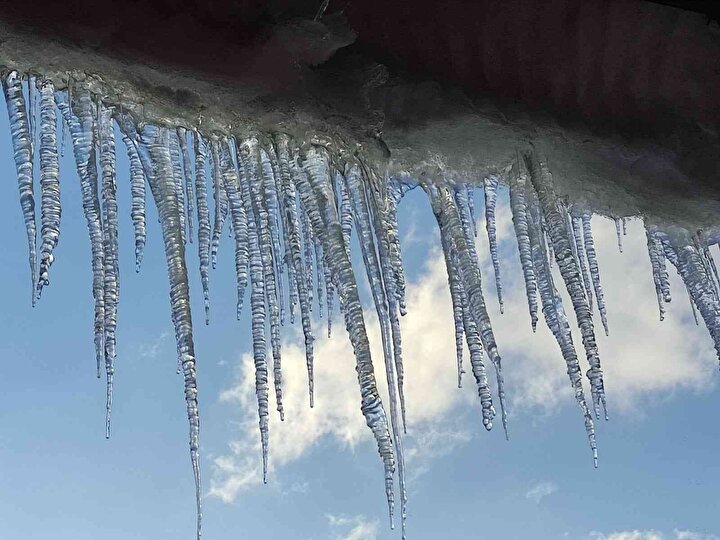 Ardahan ve ilçelerinde etkili olan kar yağışının ardından etkisini göstermeye başlayan dondurucu soğuklar nedeniyle çatılardan yaklaşık 3 metrelik buz sarkıtları sarkmaya başladı.