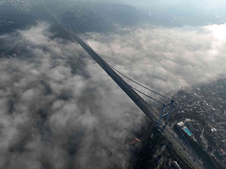 İstanbul'u etkisi altına alan sis, Fatih Sultan Mehmet Köprüsü'nde masalsı bir görüntü ortaya çıkardı. Adeta sis bulutunun üzerinde asılı duran Fatih Sultan Mehmet Köprüsü ve üzerinden geçen araçlar, eşsiz bir manzara oluşturdu.