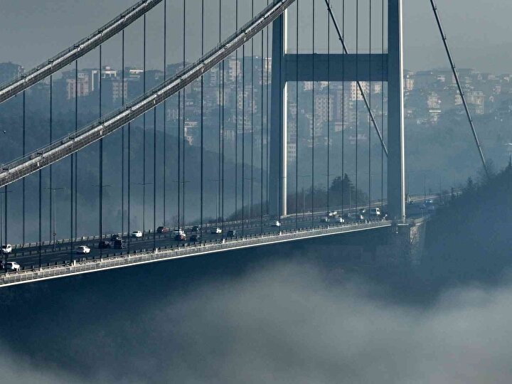 İstanbul'u etkisi altına alan sis, Fatih Sultan Mehmet Köprüsü'nde masalsı bir görüntü ortaya çıkardı. Adeta sis bulutunun üzerinde asılı duran Fatih Sultan Mehmet Köprüsü ve üzerinden geçen araçlar, eşsiz bir manzara oluşturdu.