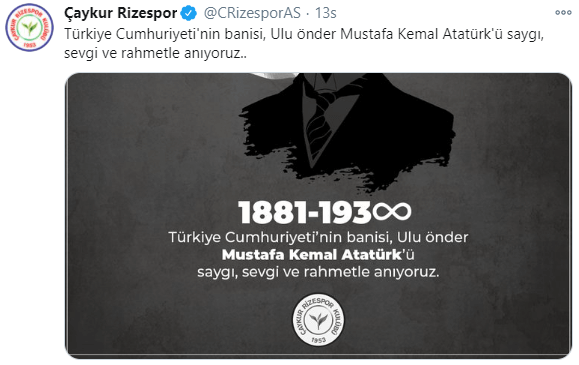 Futbol kulüpleri, vefatının 82. yılında Türkiye Cumhuriyeti Kurucusu Ulu Önder Atatürk'ü andı. İşte futbol kulüpleri tarafından 10 Kasım Atatürk'ün vefatı için yapılan sosyal medya paylaşımları...