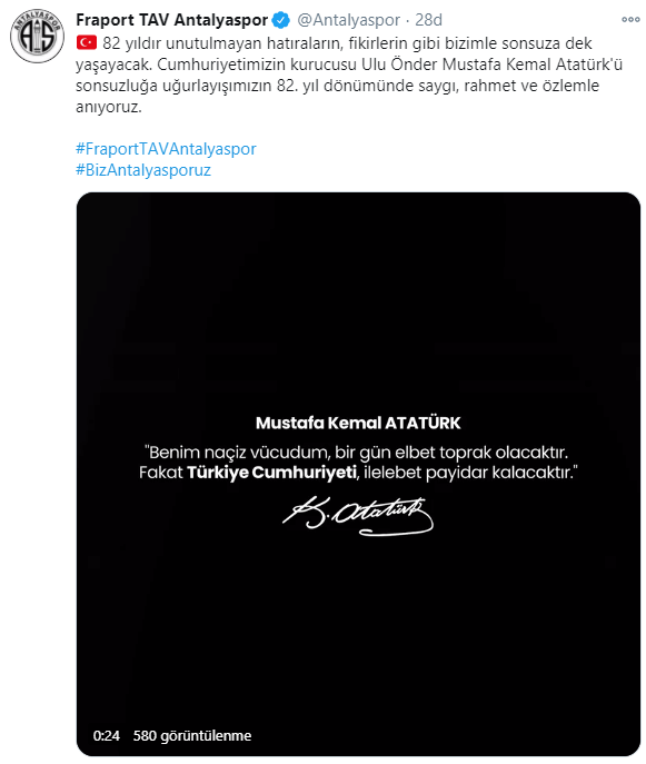 Futbol kulüpleri, vefatının 82. yılında Türkiye Cumhuriyeti Kurucusu Ulu Önder Atatürk'ü andı. İşte futbol kulüpleri tarafından 10 Kasım Atatürk'ün vefatı için yapılan sosyal medya paylaşımları...