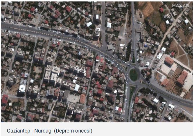 Kahramanmaraş depremine ilişkin ilk uydu görüntüleri yayınlandı. Yayınlanan ilk görüntü İslahiye ve Nurdağı ilçelerine ait. Görüntüde Gaziantep'in ilçelerinde ciddi yıkım olduğu görülüyor.
