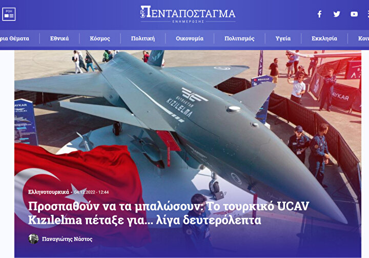 Savunma sanayiinde peş peşe dev atılımlar gerçekleştiren Türkiye'nin gücü, Yunanistan'da konuşulmaya devam ediyor. Atina yönetimi her ne kadar Ege ve Akdeniz'de ABD ve Avrupa ülkelerinden aldığı destekle Türkiye'ye karşı provokatif girişimlerde bulunsa da, Yunan halkı ve medyası ülkelerinin Türkiye ile baş edebilecek bir seviyede olduğunu düşünmüyor. Son olarak geçtiğimiz gün Selçuk Bayraktar'ın ilk kez yerden teker kestiğini duyurduğu, Türkiye'nin ilk insansız savaş uçağı Bayraktar Kızılelma Yunan basınında her gün manşetleri süslüyor. Pentapostagma gazetesinde yayınlanan bir haberde Türkiye'nin görünmez bir İHA ürettiği belirtilirken "Ülkemiz bununla nasıl başa çıkacak?" sorusu soruldu.