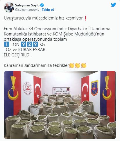 İçişleri Bakanı Süleyman Soylu, sosyal medya hesabı üzerinden yaptığı paylaşımla, Diyarbakır İl Jandarma Komutanlığı İstihbarat ve KOM Şube Müdürlüğü'nün ortaklaşa operasyonunda toplam 1 ton 929 kilogram toz ve kubar esrar ele geçirildiğini duyurdu.