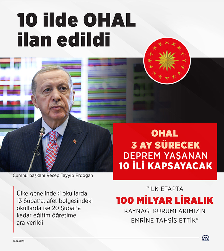 Cumhurbaşkanı Recep Tayyip Erdoğan'ın imzasıyla yayımlanan karara göre, Anayasa'nın 119. maddesi ile 2935 sayılı Olağanüstü Hal Kanunu'nun 3. maddesinin 1. fıkrasının (a) bendi kapsamında, Adana, Adıyaman, Diyarbakır, Gaziantep, Hatay, Kahramanmaraş, Kilis, Malatya, Osmaniye ve Şanlıurfa'da bugün saat 01.00'den itibaren 3 ay süreyle OHAL ilan edildi.