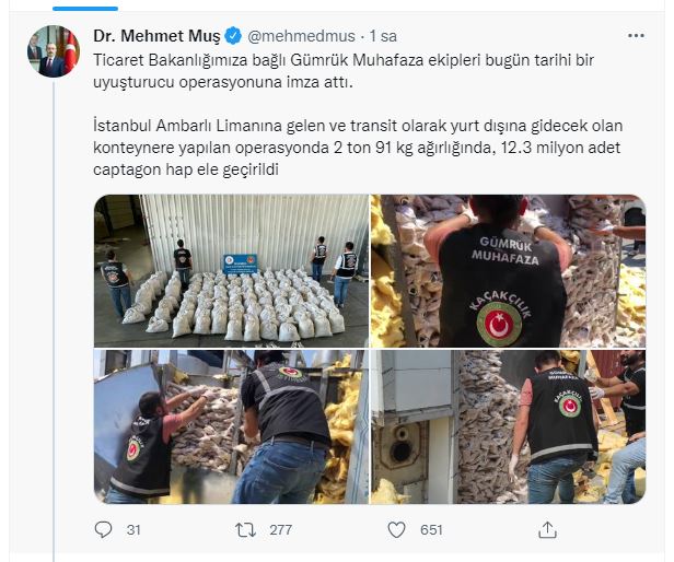 Bakan Muş, "İstanbul Ambarlı Limanı'na gelen ve transit olarak yurt dışına gidecek olan konteynere yapılan operasyonda 2 ton 91 kilogram ağırlığında, 12,3 milyon adet captagon hap ele geçirildi. Uyuşturucu kaçakçılığının organizatörü olduğundan şüphelenilen yabancı uyruklu şahıs yurtdışına kaçmak isterken havalimanında yakalandı. Bugüne kadar ülkemizde ele geçirilen en yüksek captagon yakalamasında görev alan Ticaret Bakanlığı Gümrük Muhafaza ekiplerini tebrik ediyorum." ifadesini kullandı.