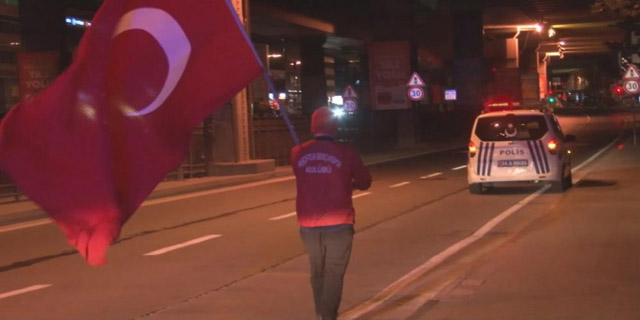 Esenyurt’tan başlayıp 15 Temmuz Şehitler Köprüsünde biten 8 saatlik yürüyüş boyunca elinden Türk Bayrağını bırakmayan Saffet Gümüş’ün yürüyüş anları Mecidiyeköy’de kameralara yansıdı.