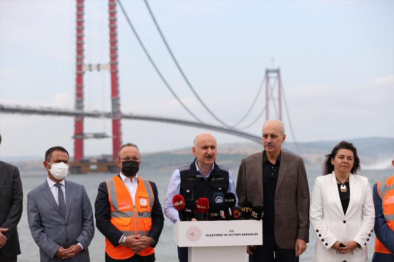 Karaismailoğlu, 1915 Çanakkale Köprüsü'nde "kedi yolundan" yapacağı inceleme öncesi gazetecilere yaptığı açıklamada, sadece kulelere yakın kısımlardaki tabliyelerin montajının kaldığını söyledi.