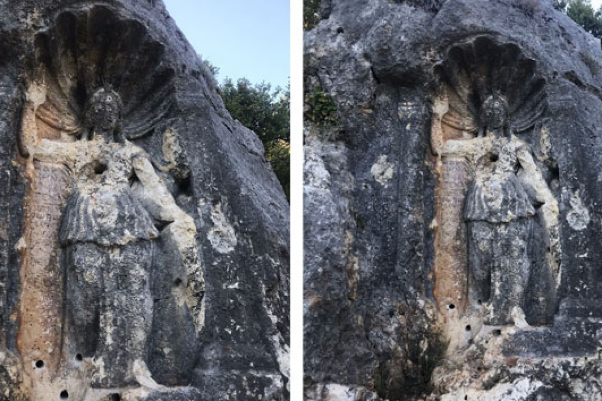"Burada dikkatimizi çeken çok ciddi bir olumsuzluk var. Maalesef yıllar önce bir dinamit lokumu yerleştirmek için hilti ile delindi ve uçurularak Athena'nın kaya kapatmasının gövde kısmı büyük zarar gördü. Ama çok yakın zamanda 5 tane yeni delikler açılmış ve buralara dinamitler yerleştirilerek tamamının uçurulması hedeflenmiş. Gerçekten çok endişe verici, büyük bir kültür mirasımız yine maalesef yok olmak üzere" ifadelerini kullandı.