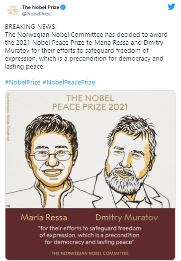 2021 Nobel Barış Ödülü, Filipinler ve Rusya'da ifade özgürlüğü için mücadele eden gazeteciler Maria Ressa ve Dmitry Muratov'a verildi.