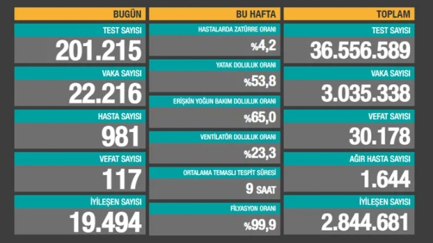 Bu tabloya göre Türkiye'de hayatını kaybedenlerin toplam sayısı 30 bin 178'e yükseldi. Şu ana dek tespit edilen toplam vaka sayısı ise 3 milyon 035 bin 338 olarak belirtildi.