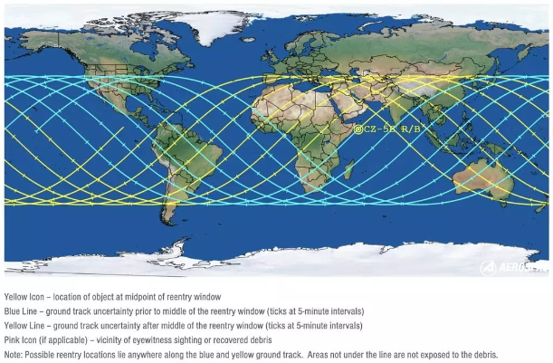 Çin roketiyle ilgili bir tweet atan Aerospace Corporation, bir harita paylaştı. Haritaya göre, roketin düşebileceği yerlerin ihtimalleri arasında Türkiye de var. Ancak bu çok düşük bir ihtimal olarak gözüküyor.