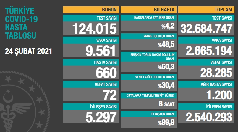Sağlık Bakanlığı açıkladığı tablo ile 24 Şubat 2021 Çarşamba Türkiye koronavirüs durumunu yayınladı. Tabloya göre bugün 9 bin 561 yeni vakaya rastlanırken 72 vatandaşımız koronavirüs sebebiyle hayatını kaybetti. Ayrıca bugün iyileşen sayısı 5 bin 297 olarak açıklandı.