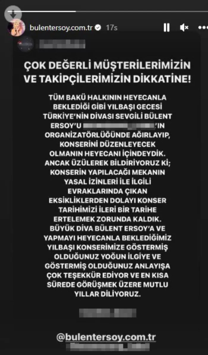 Bülent Ersoy da 3 milyon TL karşılığında Bakü'de konser verecekti. Ancak yılbaşına 2 gün kala Bülent Ersoy'un mekanda yaşanan evrak eksikliğinden dolayı konseri iptal edildi.