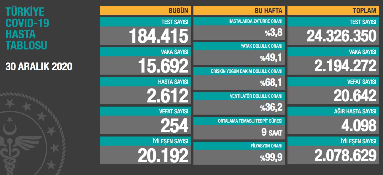 30 Aralık 2020 güncel koronavirüs tablosu yayınlandı. Sağlık Bakanı Fahrettin Koca da her zaman olduğu gibi sosyal medya platformu Twitter'da bulunan resmi hesabı üzerinden tabloyu paylaşarak günlük değerlendirmede bulundu.
